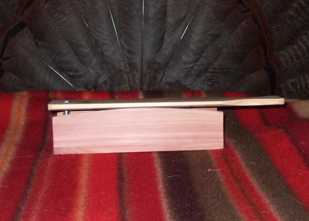 I've been making turkey box calls for years with fair success. Thought I'd try a pot belly call this time. I started with a cedar 1 1/2 X 5 X 6" long. Drilled several holes all the way through edge wise and filled the bottom with a walnut block. Looks very nice so far but the tone is very high. Sides are about 1/16" thick. Anybody have any ideas for lowering the pitch? Thinner sides? Cut the ends deeper? (I'll try to post a pic but I'm still struggling with this resize stuff. Even e-mailed these to myself but still turn out big.)