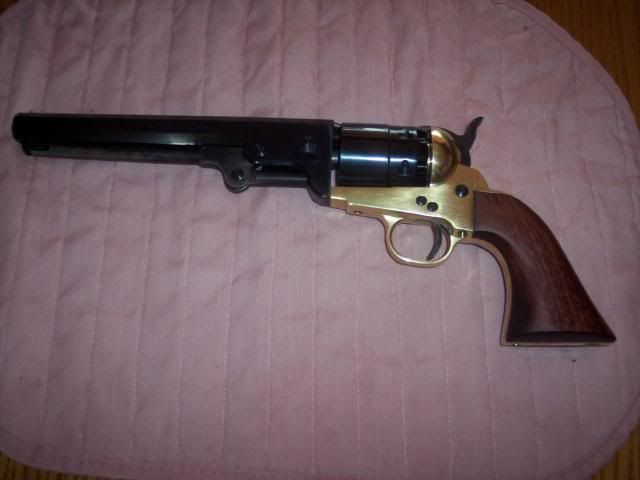 I have the same revolver, the felt wad, is for over powder and the wax one is for over ball. After I used up the ones that came with it, I just used crisco over ball. The felt wad, semolina, or cornmeal is just to take up space between powder and ball. cylinder has room for 35grs of powder, but with only 15gr load, something needs to take up extra room. I figured since it's a reb revolver, cornmeal would be good choice, cream of wheat would be, better suited for yankees. It looks like 35gr of FFF is max load for steel frame and 25gr FFF is max for brass frame. If you shoot max all the time, frame could get loose, recomended load is 12-15gr for ball loads, in 44. I've been shooting 15gr and it works fine, it seems like it's regulated at 25yds. The balls that come with it are rough, the better balls, without the sprue, shoot much better. I haven't had time, to use it yet, but I got mold for it. I learned after I got the conical one, ball shoots better and is easier to load. .454" balls shoot better in mine than .451". I'm not sure if spacer over powder is needed, from what I've heard most don't use it. I know you don't want airspace, between BP and ball and ram doesn't seat ball, deep enough to be against powder, on mine without it. They're a lot of fun, but I'm glad we have better pistols now. I sure wouldn't want to be in shootout with it. You can see why they carried extra pistols. I couldn't imagine loading it on horseback or in heat of battle. I'm guessing one gets better at it with time. |