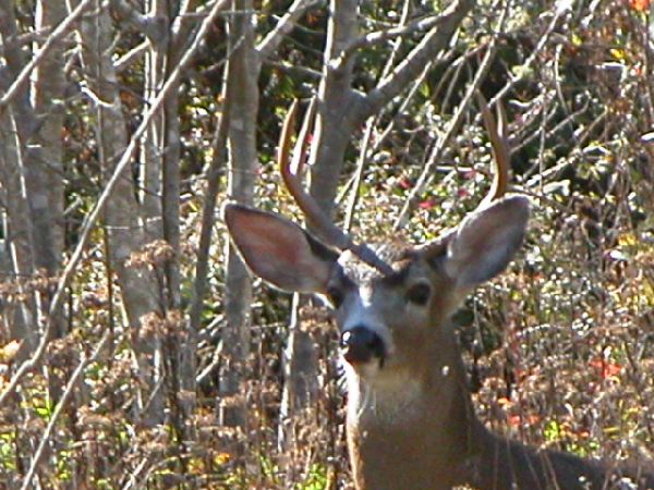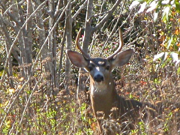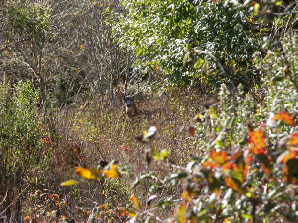During a walk yesterday I saw and watched a young blacktail buck for quite a while. I was at a local park with a hilly loop trail that goes through some woods and small open spaces. The buck crossed the trail about 60 yards ahead of me. I had my camera so I got it ready and slowly walked down the trail. There he was, about 40 yards out in some tall grass and brush. Just standing there looking at me. I took a few pics and he finally moved behind a bush. I walked further down the trail and then decided to go back and look again. He was still there and when he saw me this time he moved into the nearby trees, but just at his own pace. That's the first time I've seen a buck in my immediate area. I see does and fawns all the time. But I was starting to think there must be some immaculate conception going on, cause there ain't no bucks. Well, now I know they're really here. I guess the rut has started. Otherwise I don't think that fellow would have stuck around as long as he did. Usually I don't get many shots of any deer, but this guy let me keep zooming in more and more. |
