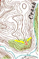 My treestand is at the red X.  Yellow indicates the deer trails usually coming from the West heading East.  The deer prefer to use this shelf as it is under tree cover compared to the open areas to the North.  To the south of my "X" are the cliffs I referred to.  It is through this bottleneck that I have seen many deer well within bow range.  With the wind coming from any direction other than east I can hunt here.