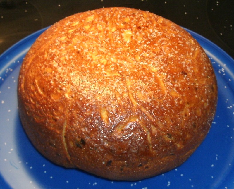 as advertised, this stuff really fills the house with a great smell. when the 40 minutes were up, i turned it out (looks like the slashing was unnecessary). here it is after a sprinkling of kosher salt: