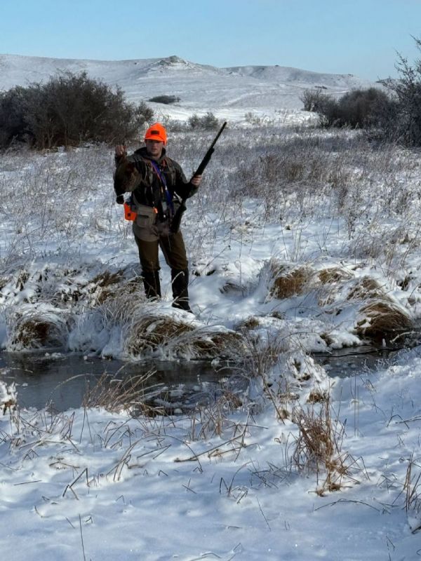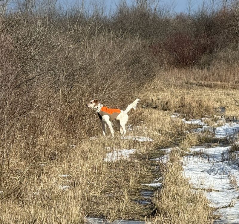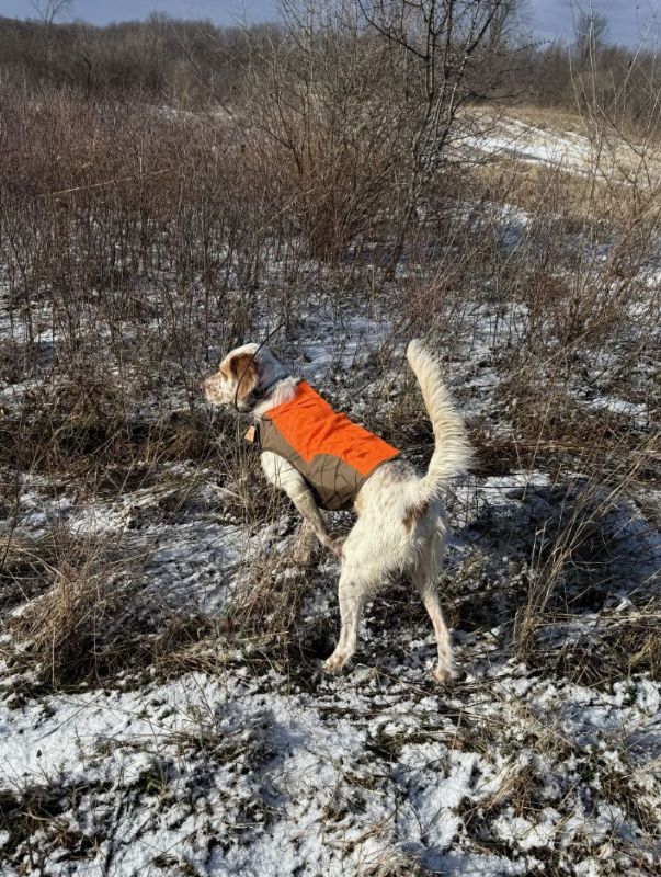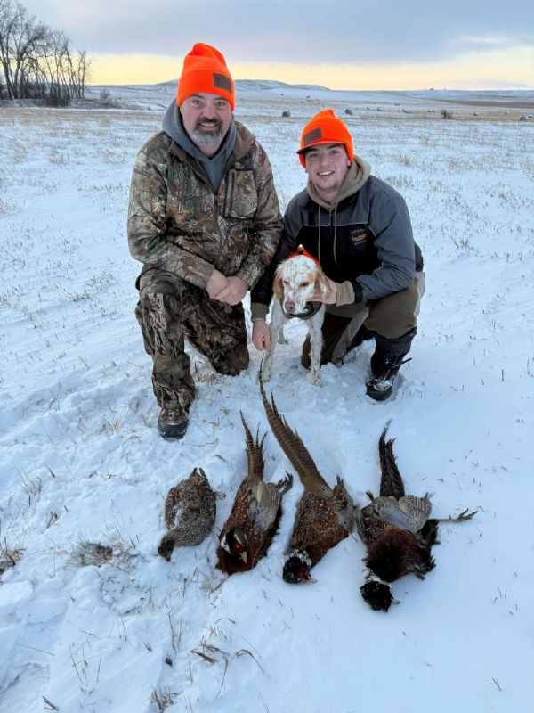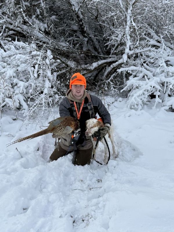 Well, when we moved back home we decided to get a dog, a well bred English Setter from a breeder in PA was the pick. Due to work we didn't get alot of time with him in the field during the summer, but we did work with handling as much as possible in the yard. I could see he would be a hunter and made the decision to head to our stomping grounds in east MT. The deer population has took a serious toll so we didn't even put in for deer tags, just 3 days before Thanksgiving trying to get some roosters. He did great! Weather was wild, first day, open water, mid to high 30s, then bam, 18" of snow and single digits. We managed to get a few (missed alot) and most important my son had a blast with his dog. We have since been going to a local bird preserve as much as possible to keep Hank progressing. He gets better every time out!!