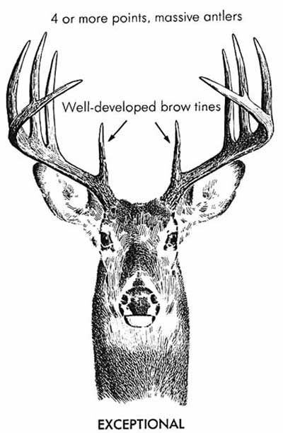 The normal…whitetail buck may be a spike or forkhorn first year; a forkhorn or a small three-pointer (eight-pointer by Eastern count). When the whitetail buck is mature, the normal head has the brow tine or eye guard and four points. Easterners call this a ten-pointer, Westerners a four-pointer. Two characteristics that make whitetail antlers different from those of mule deer are that all of the points on whitetail antlers grow off a main beam and the normal whitetail head has a large and prominent brow tine; on the other hand, normal mule deer antlers are dichotomous or evenly branched and the brow tine is smaller and is sometimes missing altogether….