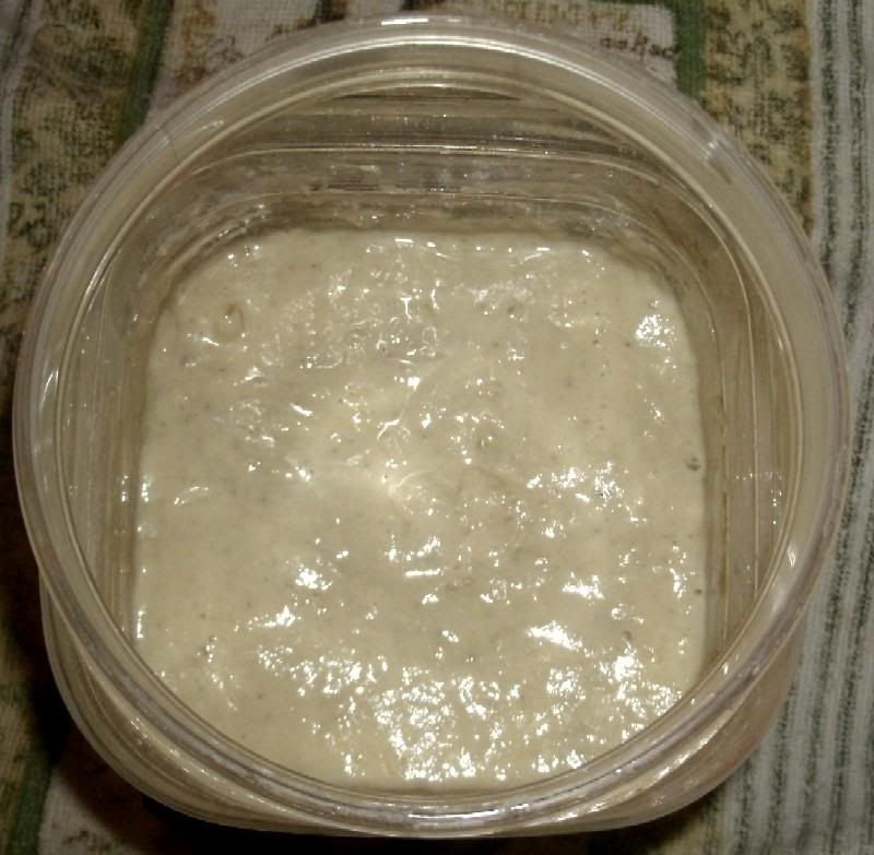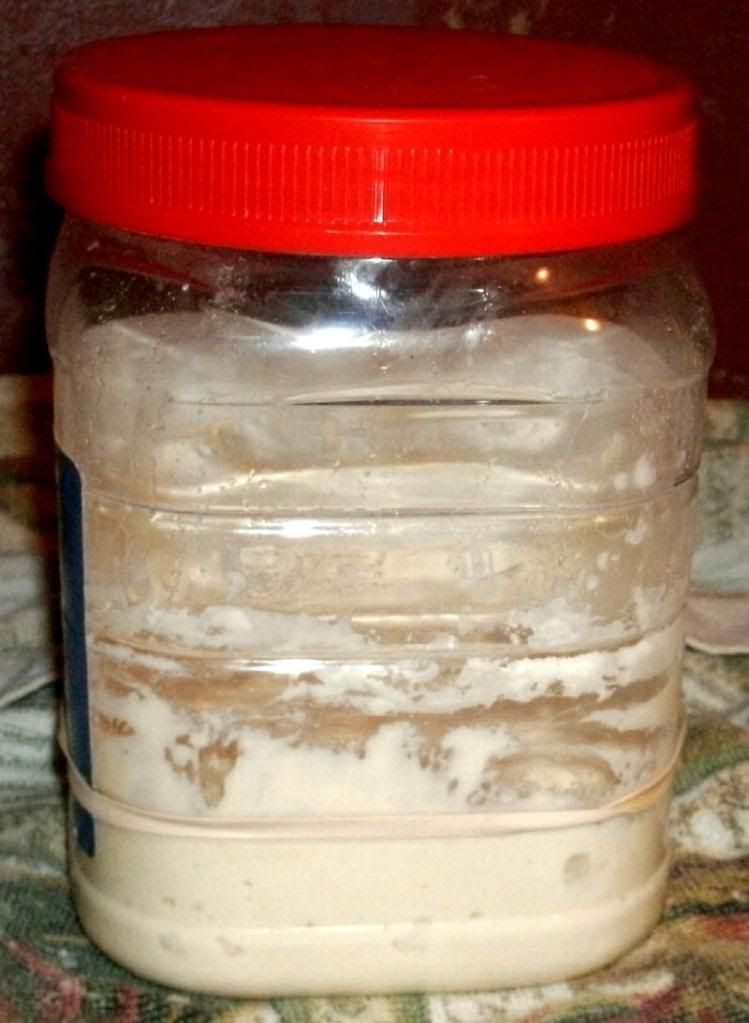 ![]() i then put the lid on loosely so that fermentation gasses could escape and a rubber band around the container right at the level where the batter was in order to give a person an indication of whether it is rising and when it will be doubled in size.:
