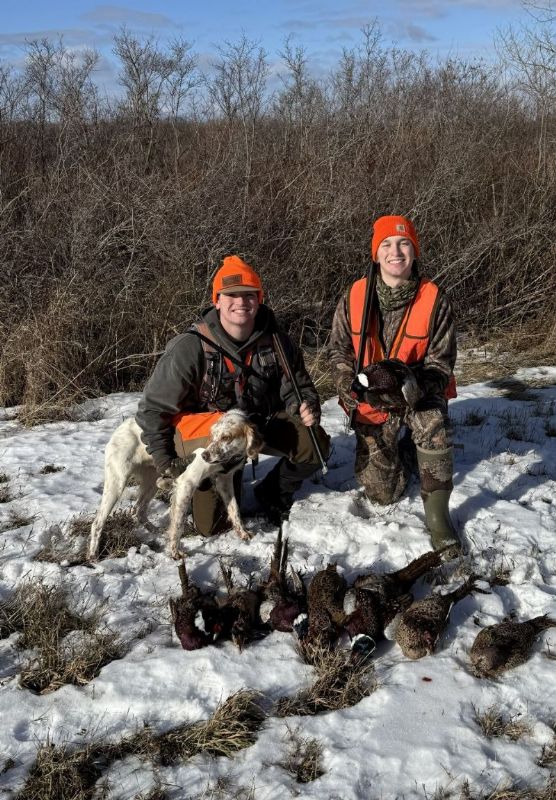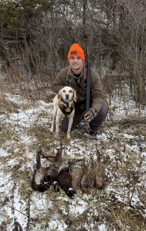 Well, when we moved back home we decided to get a dog, a well bred English Setter from a breeder in PA was the pick. Due to work we didn't get alot of time with him in the field during the summer, but we did work with handling as much as possible in the yard. I could see he would be a hunter and made the decision to head to our stomping grounds in east MT. The deer population has took a serious toll so we didn't even put in for deer tags, just 3 days before Thanksgiving trying to get some roosters. He did great! Weather was wild, first day, open water, mid to high 30s, then bam, 18" of snow and single digits. We managed to get a few (missed alot) and most important my son had a blast with his dog. We have since been going to a local bird preserve as much as possible to keep Hank progressing. He gets better every time out!!
