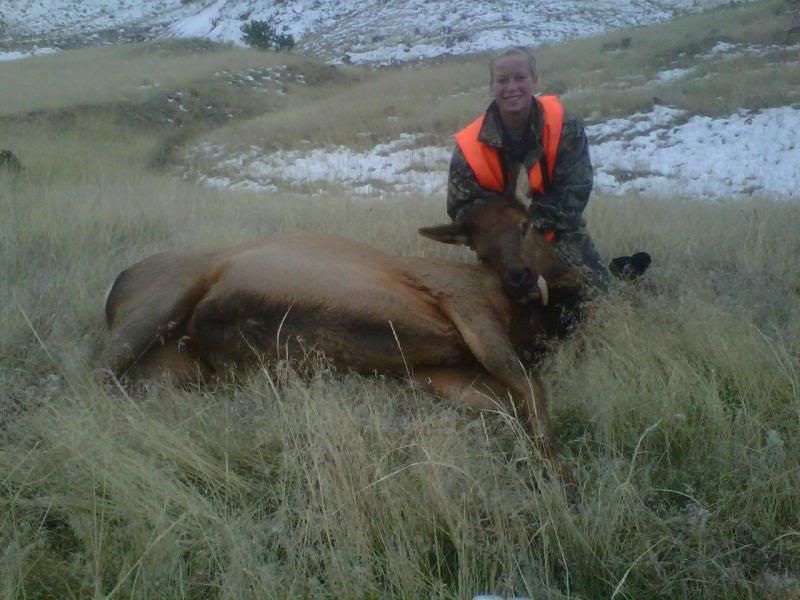We got them at the same time. I was very impressed once again with her .257 Roberts. her Elk dropped right where it stood at a ranged 224 yards. she hit it in the neck and it went into the off side shoulder. Dead before it hit the ground. I was also very impressed with her shooting.