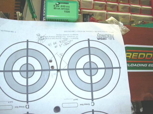 We then fired the next 3 shot group with 41 grains of 4350 . same components and lengths for a group of .74" center to center fartherest bullet.No signs of pressure problems,easy extraction.I am gonna load some at 42 grains and see if I can bring it in a little tighter.I don`t know though from a 16.5" sporter barrel how tight I can get it.