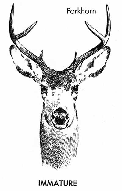 [T]he yearling mule deer is generally a spike, but may be a forkhorn. With rich food and plenty of it, he may grow four points and a brow tine his second fall. Antlers reach the maximum size between the fifth and eighth years….